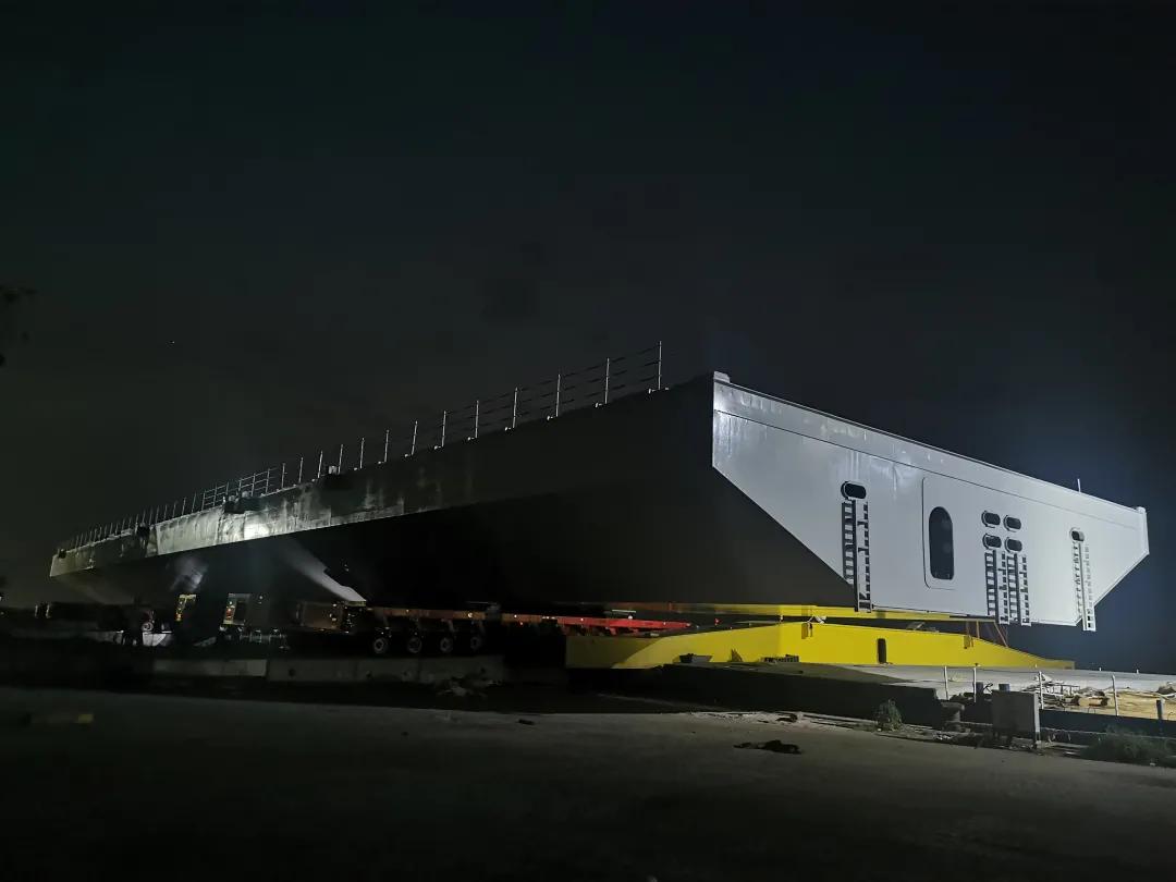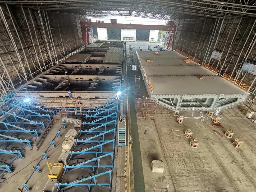 同樣承擔(dān)了深中通道隧道沉管鋼殼制造任務(wù)的中國船舶集團(tuán)旗下廣船國際,近日剛剛完成了E15管節(jié)鋼殼的過駁交付。E16鋼殼計劃在9月底前進(jìn)行聯(lián)合驗(yàn)收;E17鋼殼則正在進(jìn)行大節(jié)段總組。