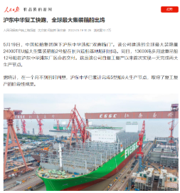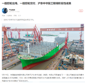 5月19日,中國船舶集團旗下滬東中華雙喜臨門。其建造的全球最大裝箱量24000TEU超大型集裝箱船2號船在長興造船基地順利出塢;建造的13000噸多用途重吊船12號船在浦東廠區(qū)命名交付,標(biāo)志著該項目圓滿收官。這是滬東中華自復(fù)工復(fù)產(chǎn)以來首次實現(xiàn)一天完成兩大生產(chǎn)節(jié)點。
